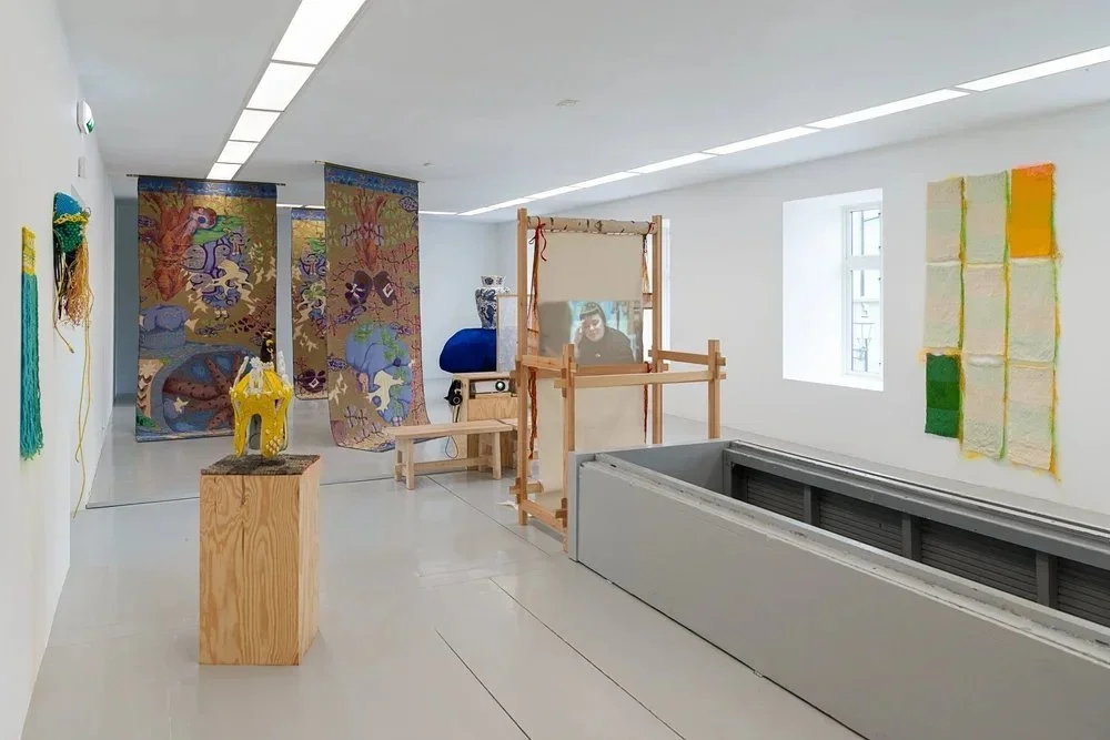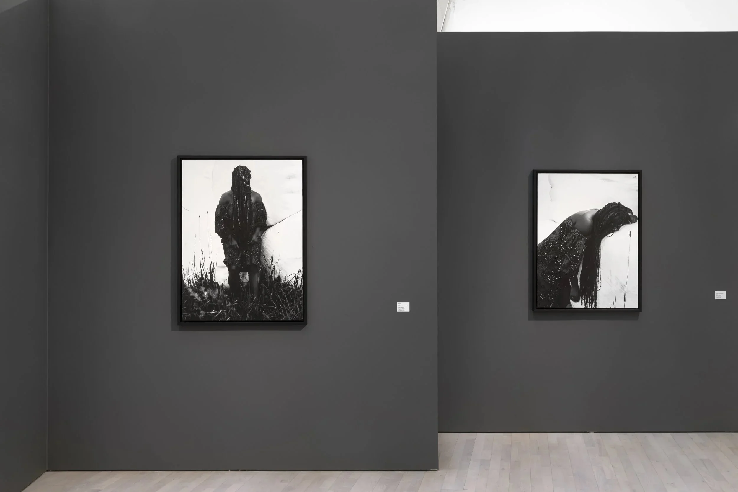 The suit is made with woven raffia, inspired by various Central African textile practices like the Kuba people of western Kongo and the Makere people of northern Kongo, translated into a contemporary expression.